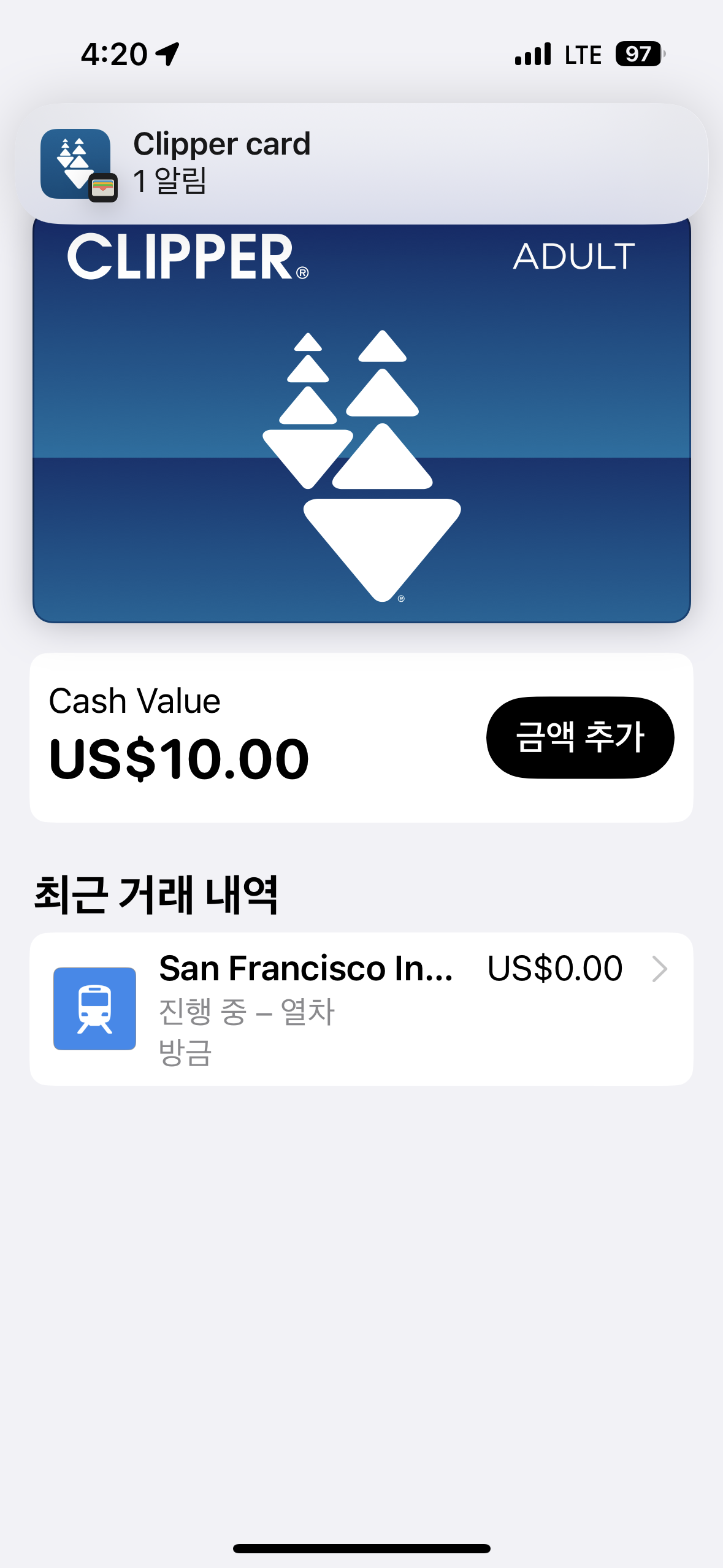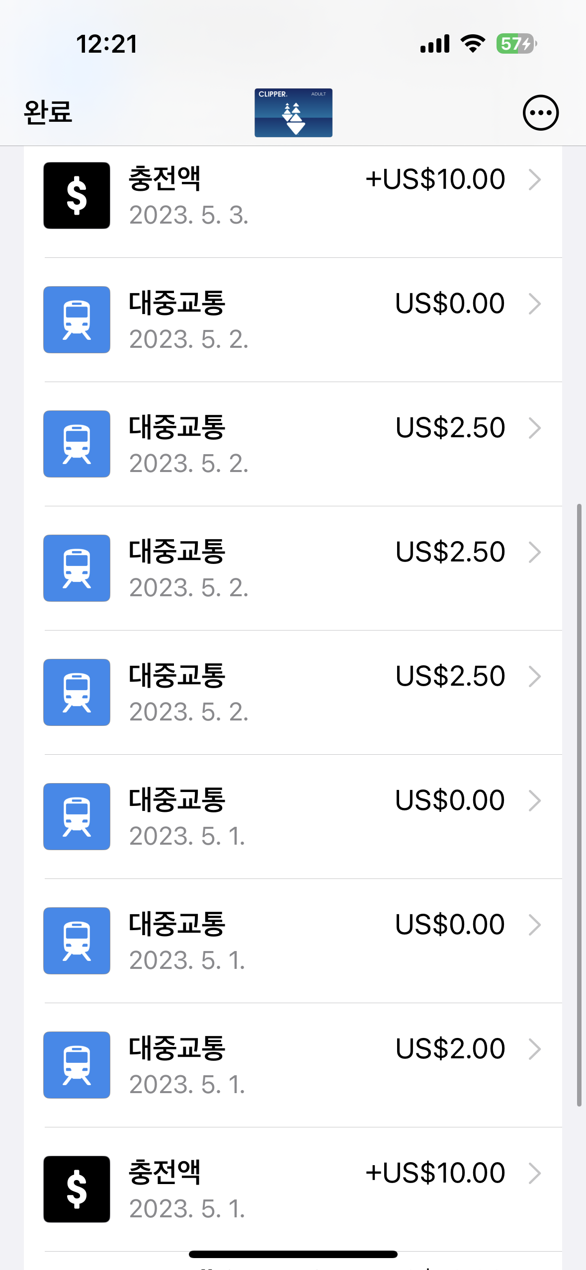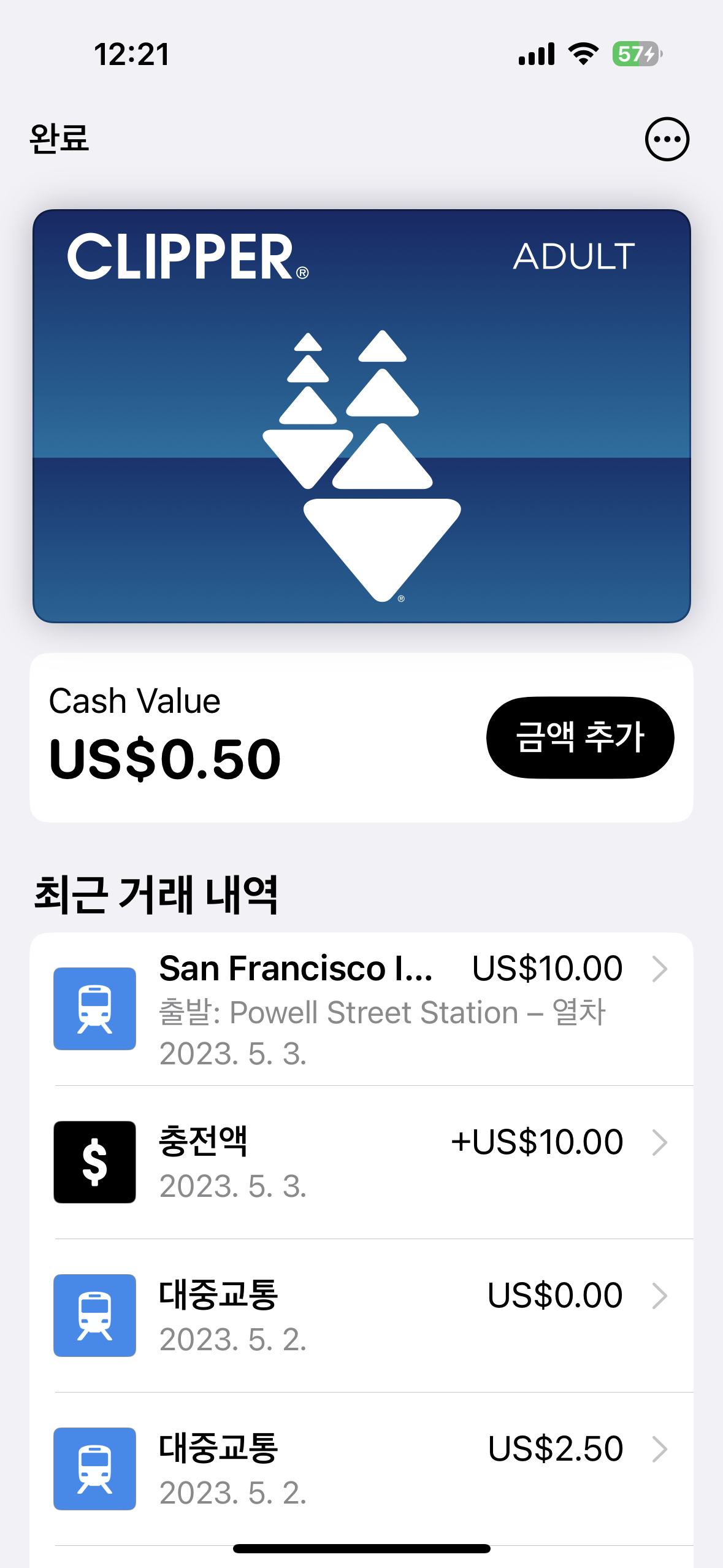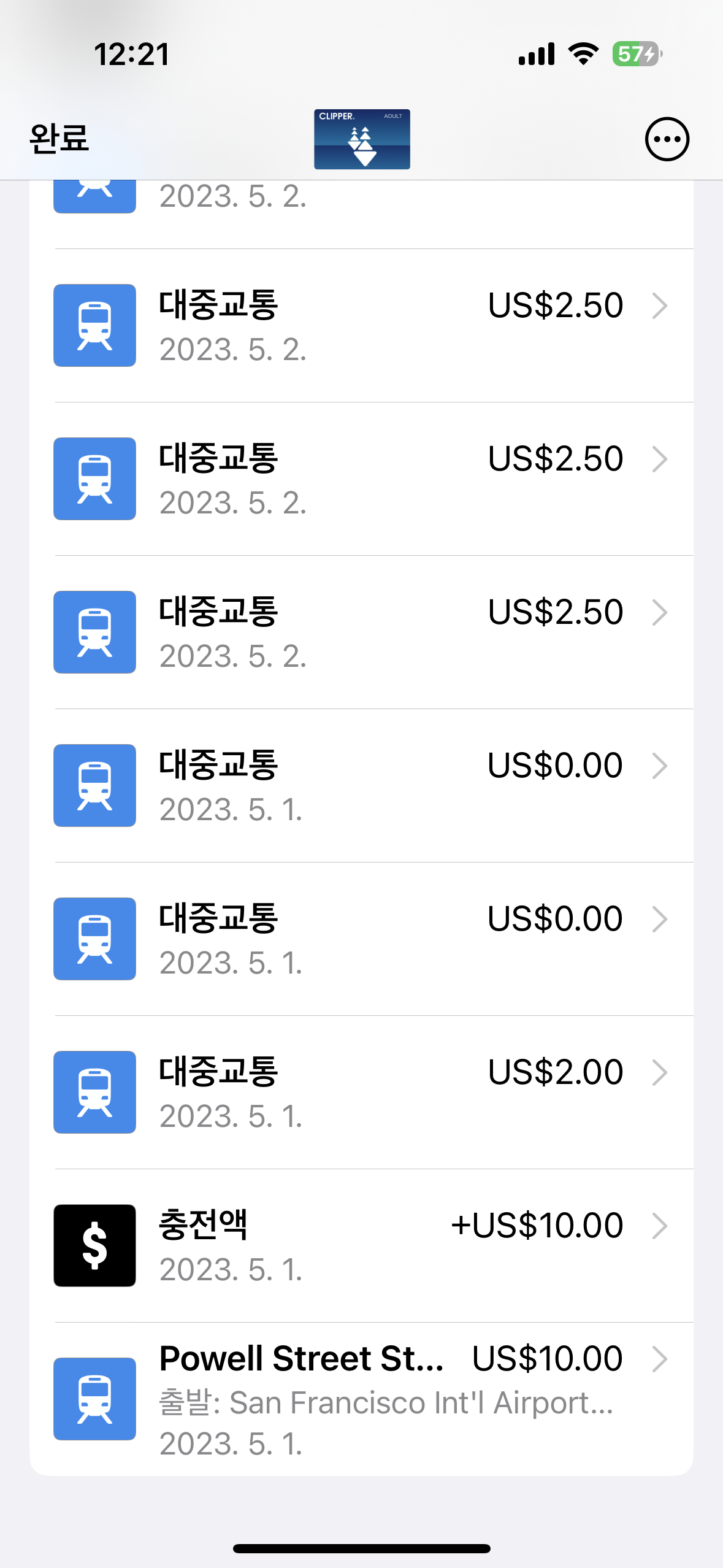 길지 않은 샌프란시스코 여행 기간 동안 사용한 클리퍼카드 내역은 애플지갑에서 이렇게 확인된다.
