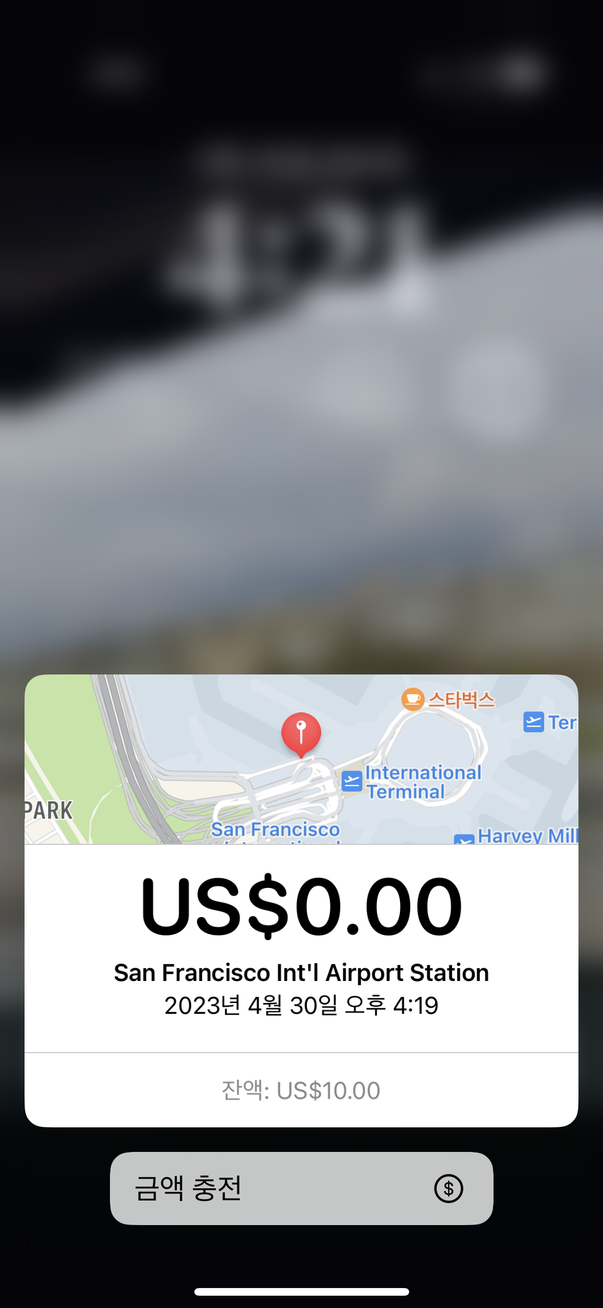 공항에서 바트를 타고 샌프란시스코 시내를 진입할때 일단 클리퍼카드에 10달러 충전이 되어있어야 한다. 예전에 플라스틱 클리퍼카드 쓰던 여행후기들을 보면 보증금 3달러를 내야 하는 억울함이 있었는데 아이폰 애플페이 (지갑) 기능을 이용하면서 이런 보증금 3천500원 가량을 아낄 수 있게 되었다. 다만 충전 방식이라 여행에서 돌아올때 충전금액이 남으면 환불이 안된다. 그러니 쓸때마다 2달러, 5달러, 10달러 단위로 충전을 하는 센스가 필요하다.