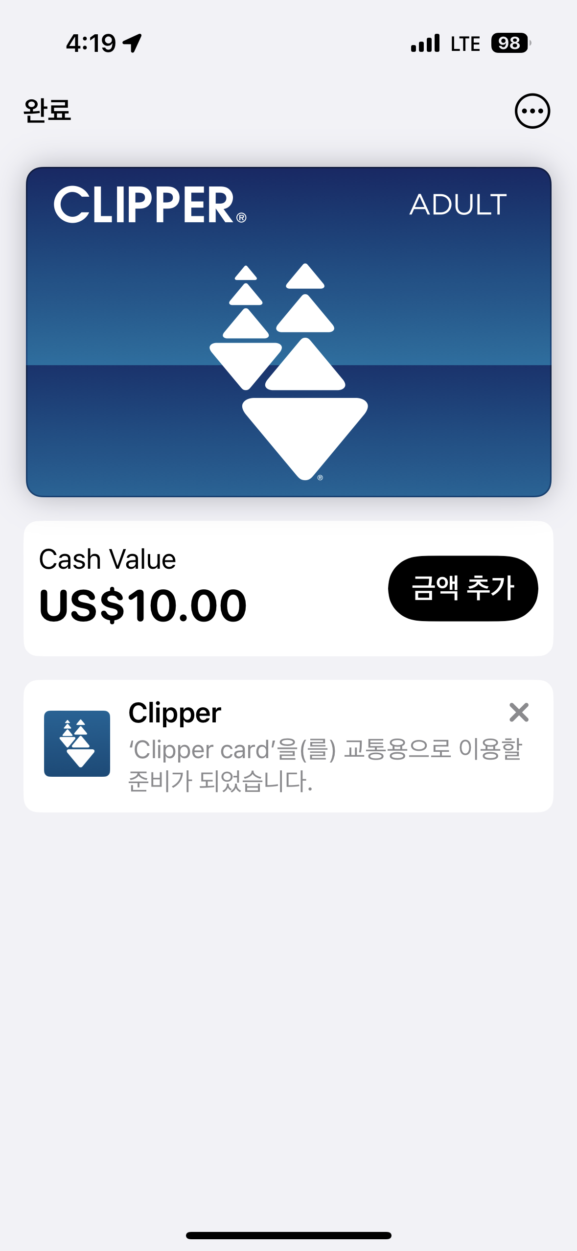 그리고 준비한 클리퍼카드 충전 확인.