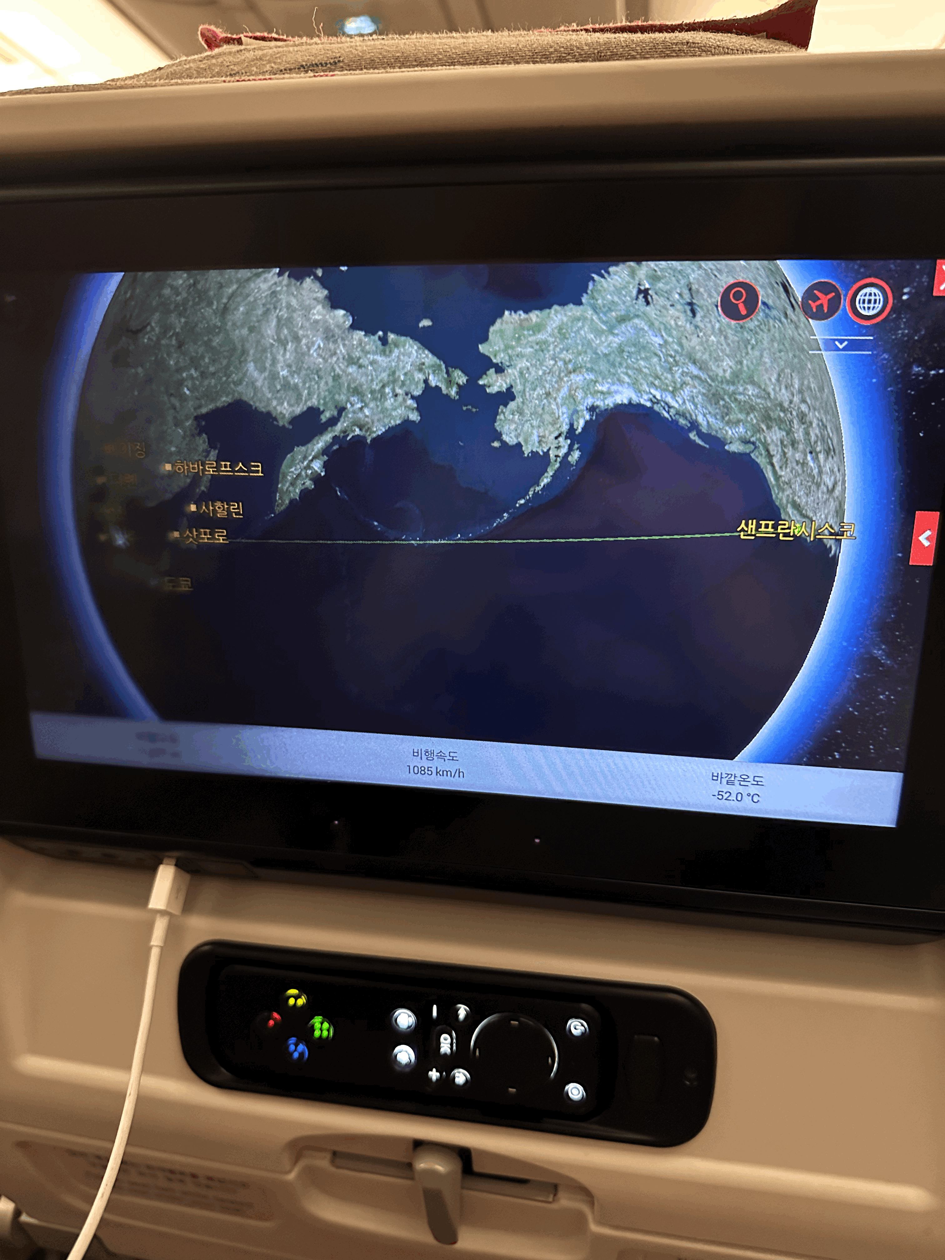 샌프란시스코 가는 길을 예전보다 입체적으로 보여주고 핀치 줌 인 아웃도 가능하다. 아래쪽에 USB A 꽂는 포트도 있다. 비행기 타는 내내 에어플레인모드로 해놓고 핸드폰을 충전했다. 미국에 내려서 바로 핸드폰을 사용할 수 있었다.