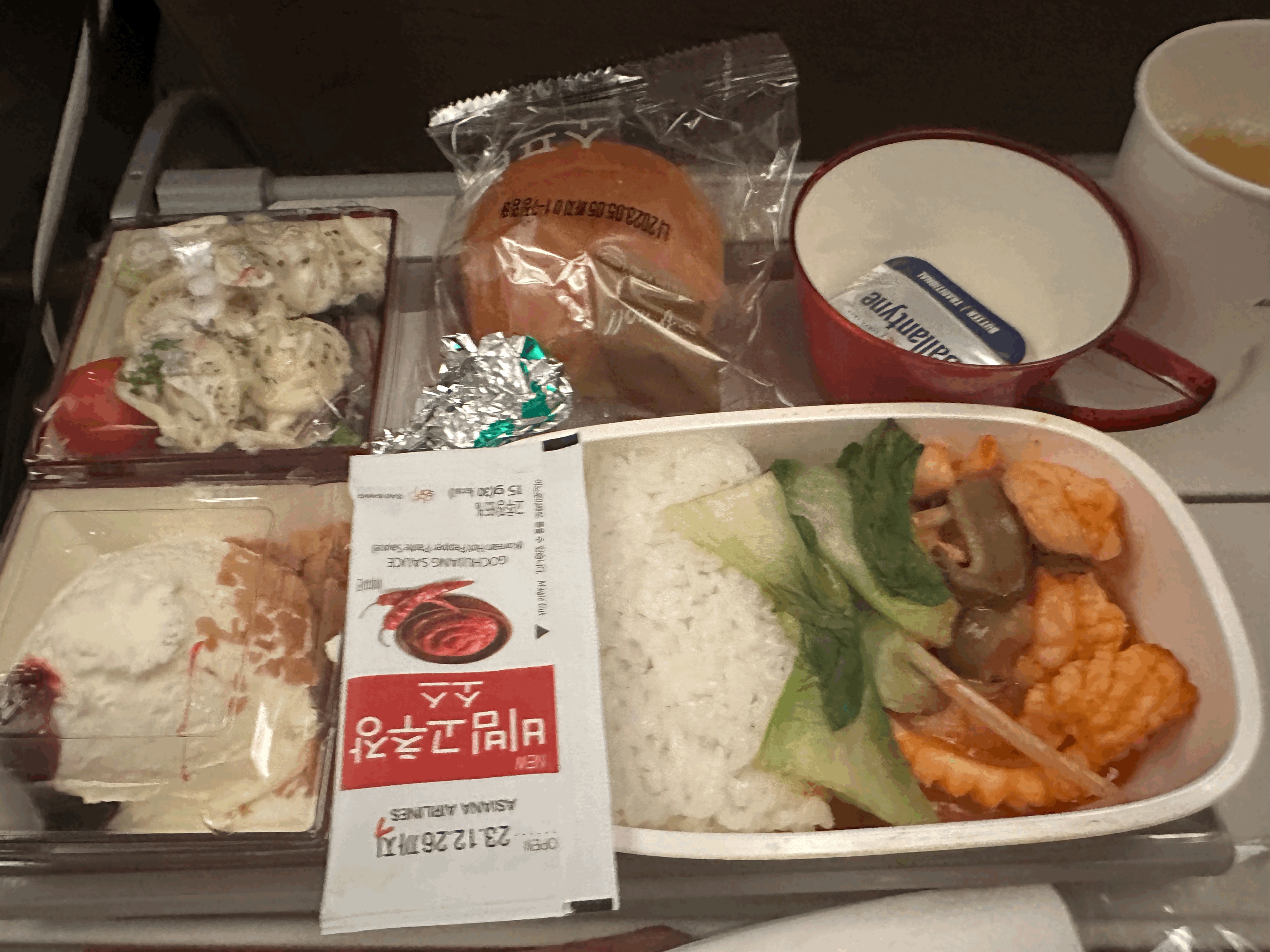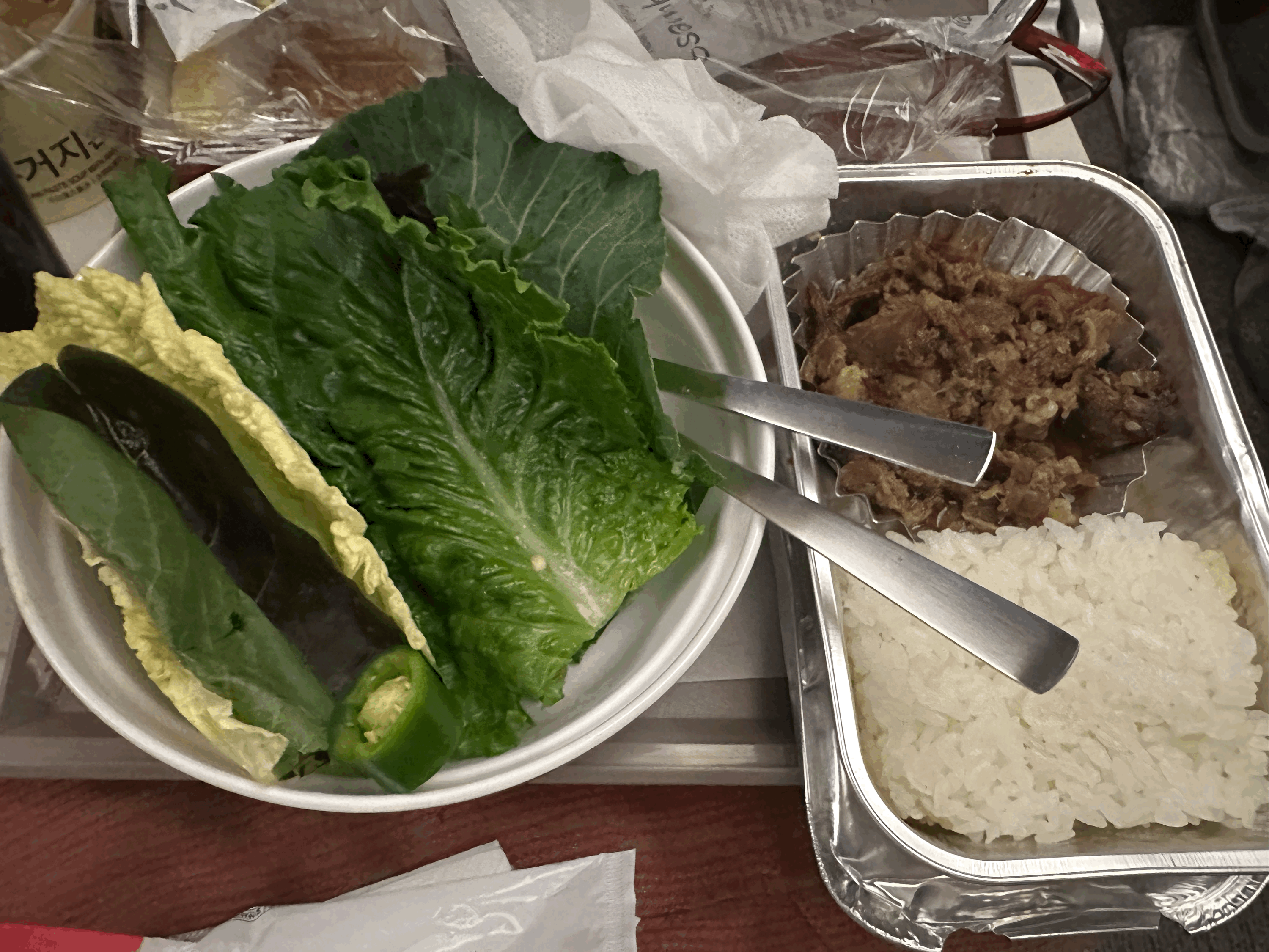 코로나 이후 무척 오랫만에 비행기를 탄 것 같다. 그 사이에 인터넷에 사람들이 올려놓은 후기로만 기내식에 쌈밥이 나온다는 것도 알게 되었고, 채식주의자를 위한 식단이나 과일식같은것도 가능하다는 것도 알게 되었다. 아무튼 평범하게 가자는 생각에 이번에도 그냥 주는대로 먹을 생각으로 사전에 다른 특별식을 고르지 않고 비행기에 탔다. 미국행 왕복 모두 밤 비행기였는데 비행기타고 한 두시간 사이에 처음 식사를 하게 되었다. 불과 몇시간전에 공항라운지에서 밥을 먹었는데도 밥은 또 들어간다. (스카이허브 라운지 후기는 맨 아래 링크 참고)