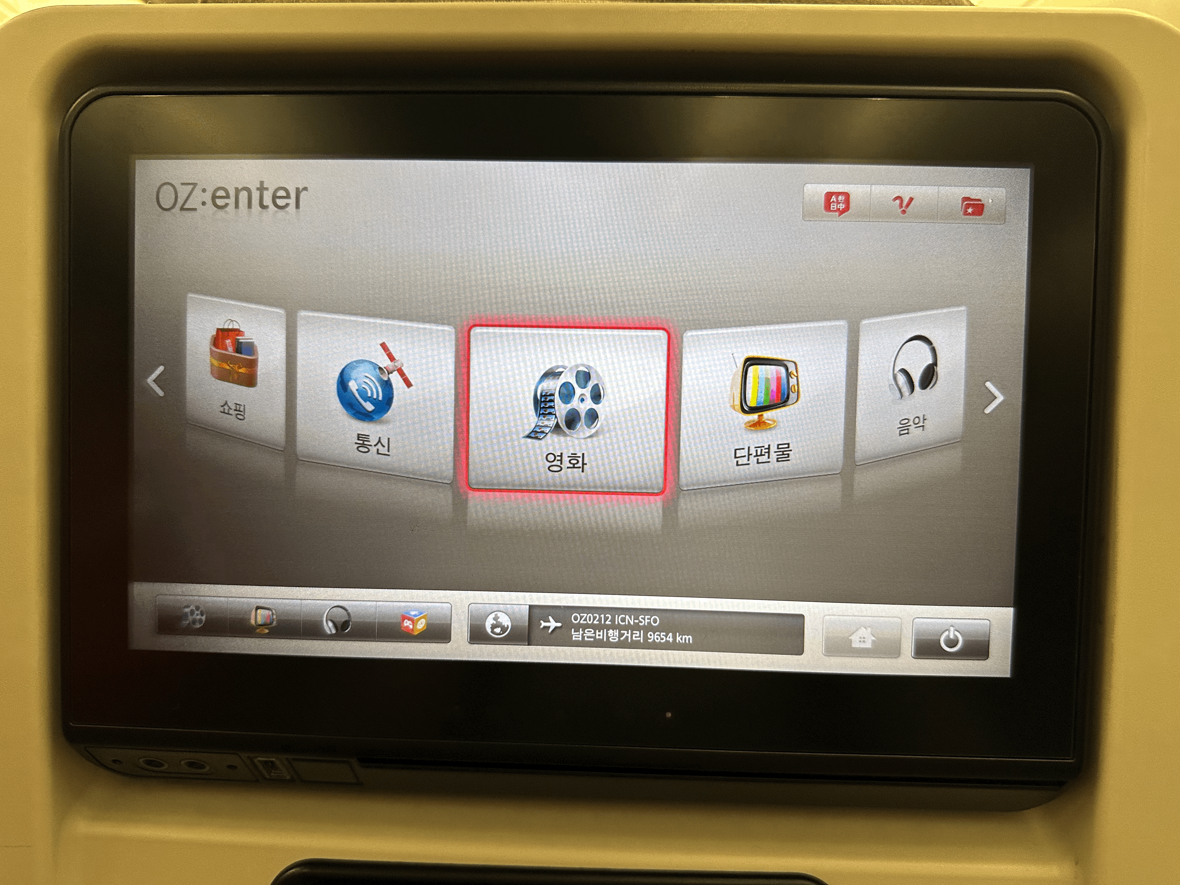 좌석앞에 모니터는 이렇게 메뉴가 구성되어 있었다, 영화는 별로 볼게 없었다.