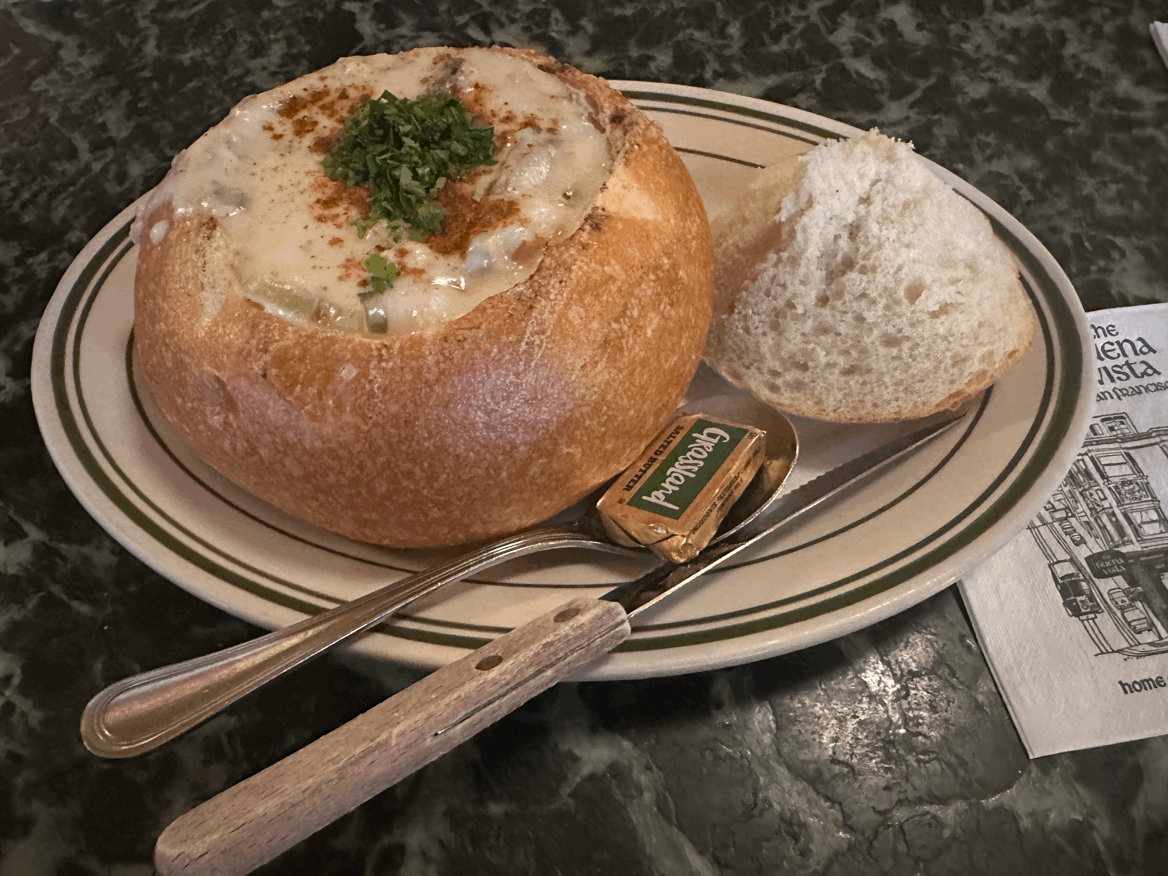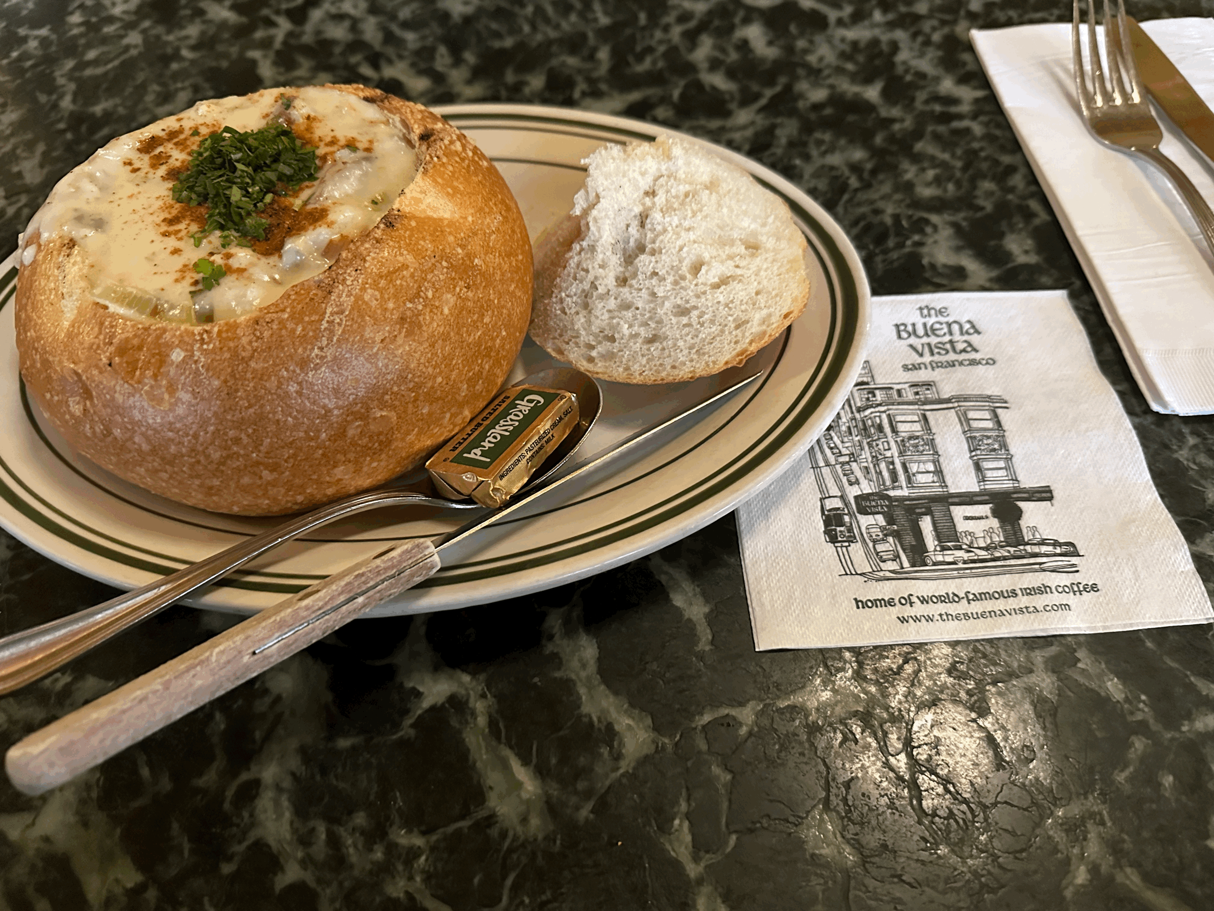 샌프란시스코 여행을 다녀와서 기억에 남는 음식이 많지만 브에나비스타 카페의 크램차우더 스프와 아이리시 커피를 잊을 수 없습니다. 한국에서 크램차우더 스프는 이상하게 건더기가 적고 빵에 스프를 넣어주는건 비슷한데 한끼 식사가 되지 않을 정도로 양이 적어요. 그런데 샌프란시스코에서는 이게 하나의 단일 메뉴가 될 정도로 양이 아주 든든합니다.
