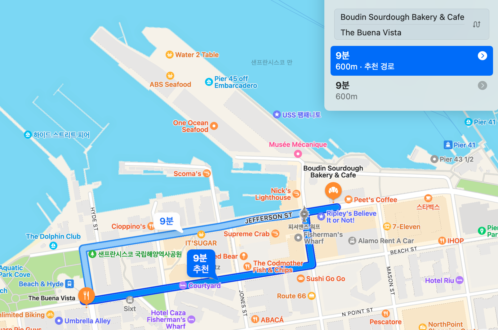 그런데 원래 피어39 부근은 관광지라 크램차우더 스프나 게 요리 등 기본 이상하는 맛있는 집이 많아요 Boudin 같은 식당이 대표적인데 여긴 워낙 관광명소라 이번에는 그 옆에 좀 떨어져 있는 브에나비스타 카페를 갔어요. 두 가게가 걸어서 9분 거리