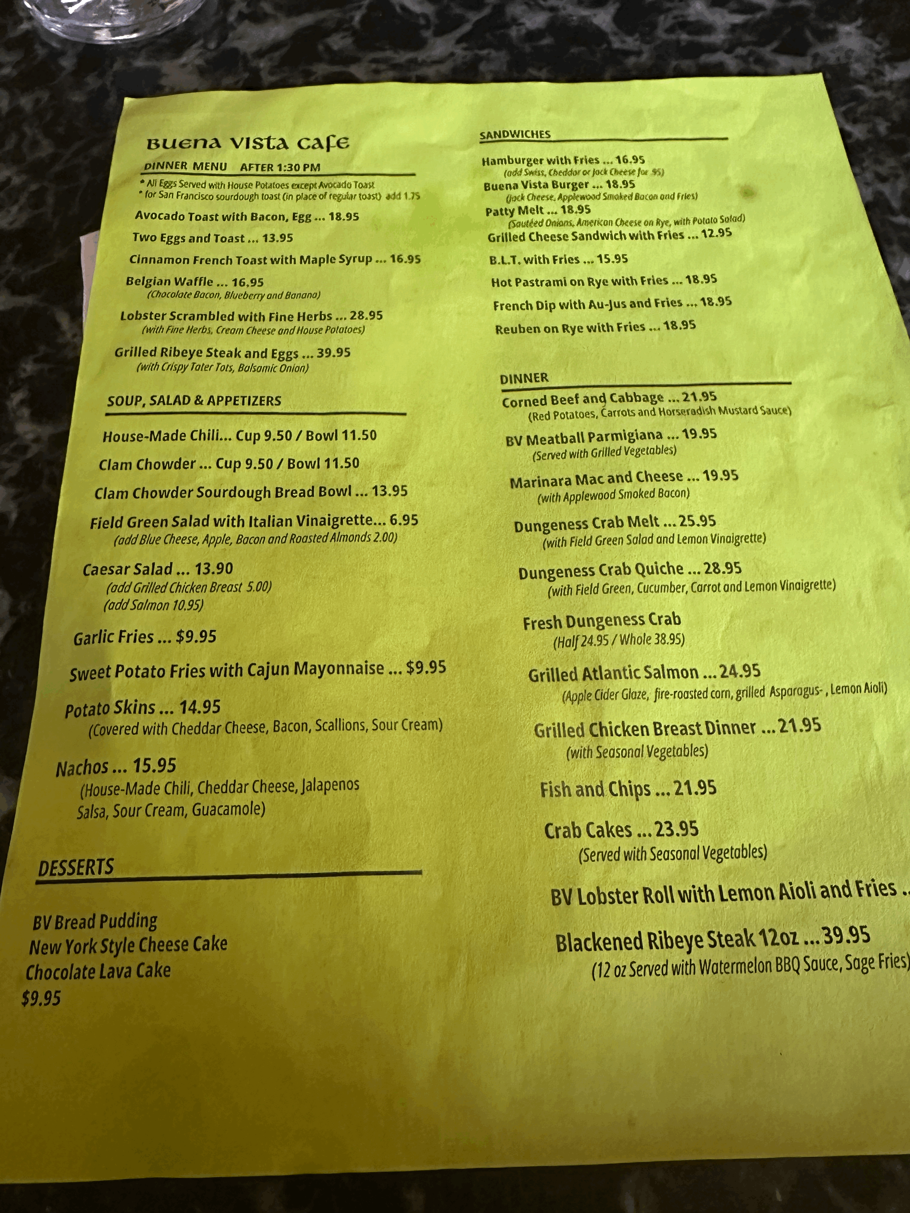 메뉴판입니다. 23년 5월 메뉴판입니다. 제가 주문하는건 13.95달러네요. 물론 미국은 기본적으로다가 20% 정도의 팁을 줘야 하니까. 가격이 좀 그렇죠. 그래도 여기서 파는 메뉴 맛난거 많은데 오늘은 크램차우더랑 아이리시 커피를 마시기로.