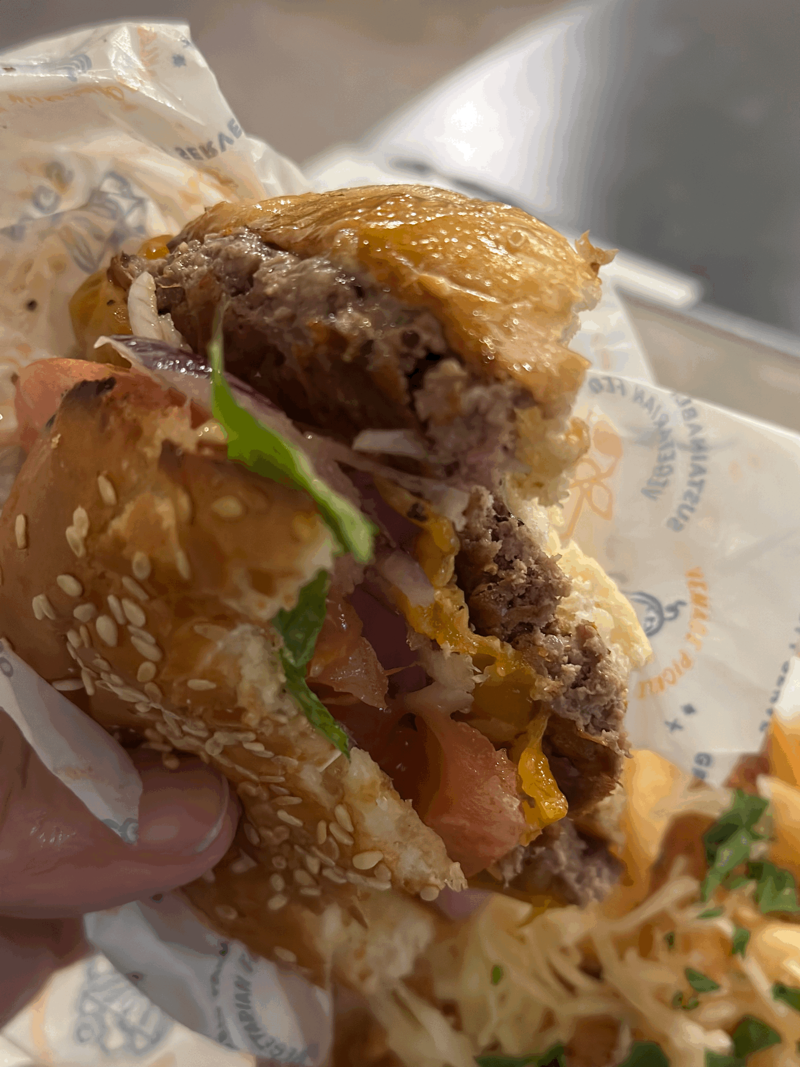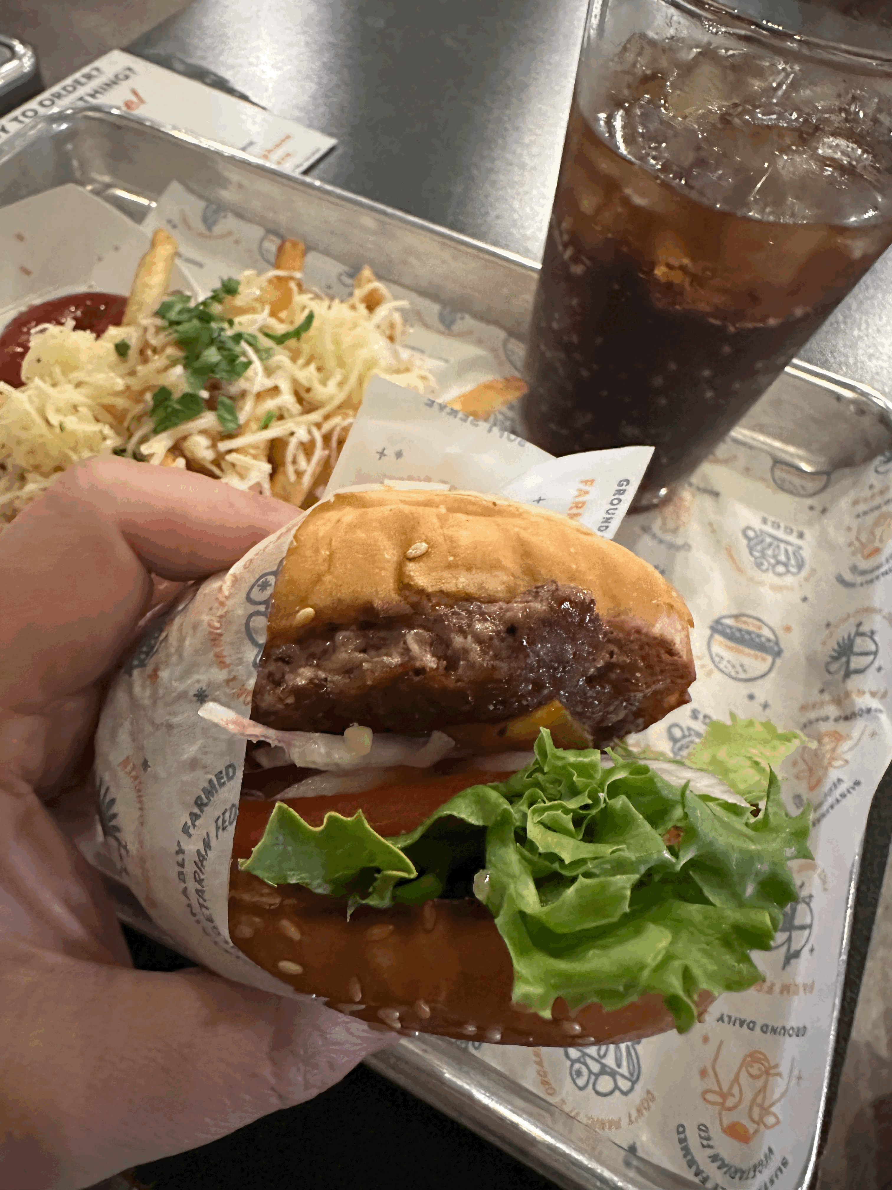 기본 햄버거보다 작은 미니 사이즈를 시킴. 너무 큰거 같아서. 그리고 음료와 갈릭 감자튀김... 가격이 벌써 2만원이 넘는다. 나왔다. 감자튀김위에 마늘소스 뭐가 좀 뿌려져잇고 햄버거는 미니 사이즈가 우리나라 햄버거 보통 사이즈. 빵도 그냥 딱 그 정도..