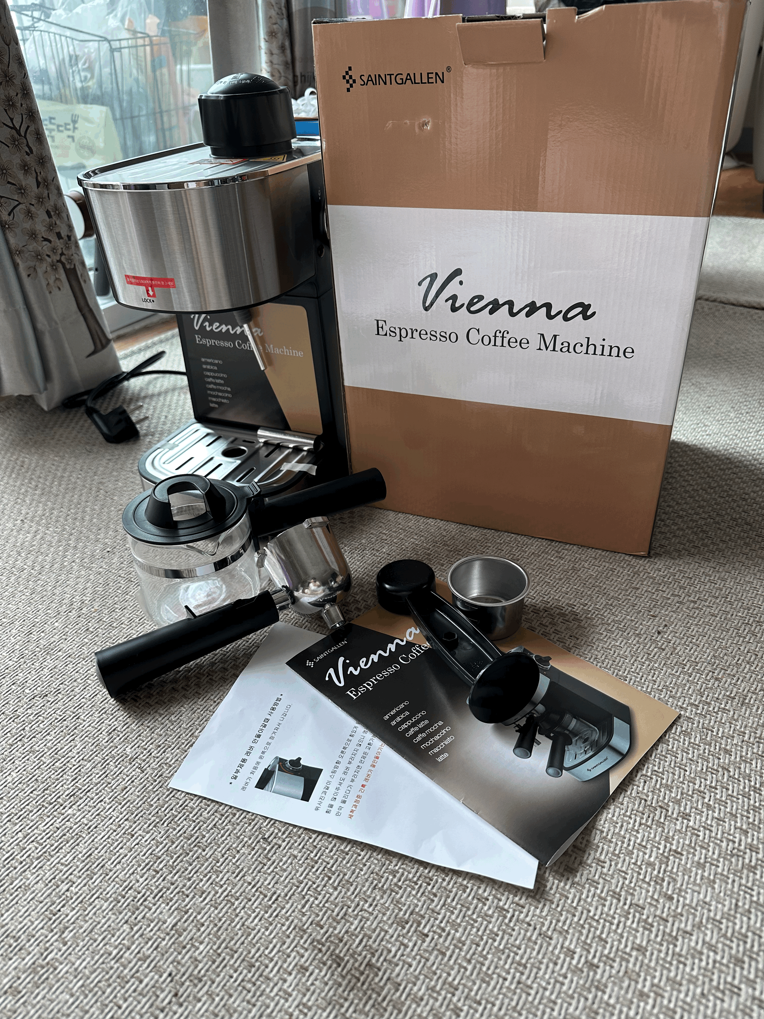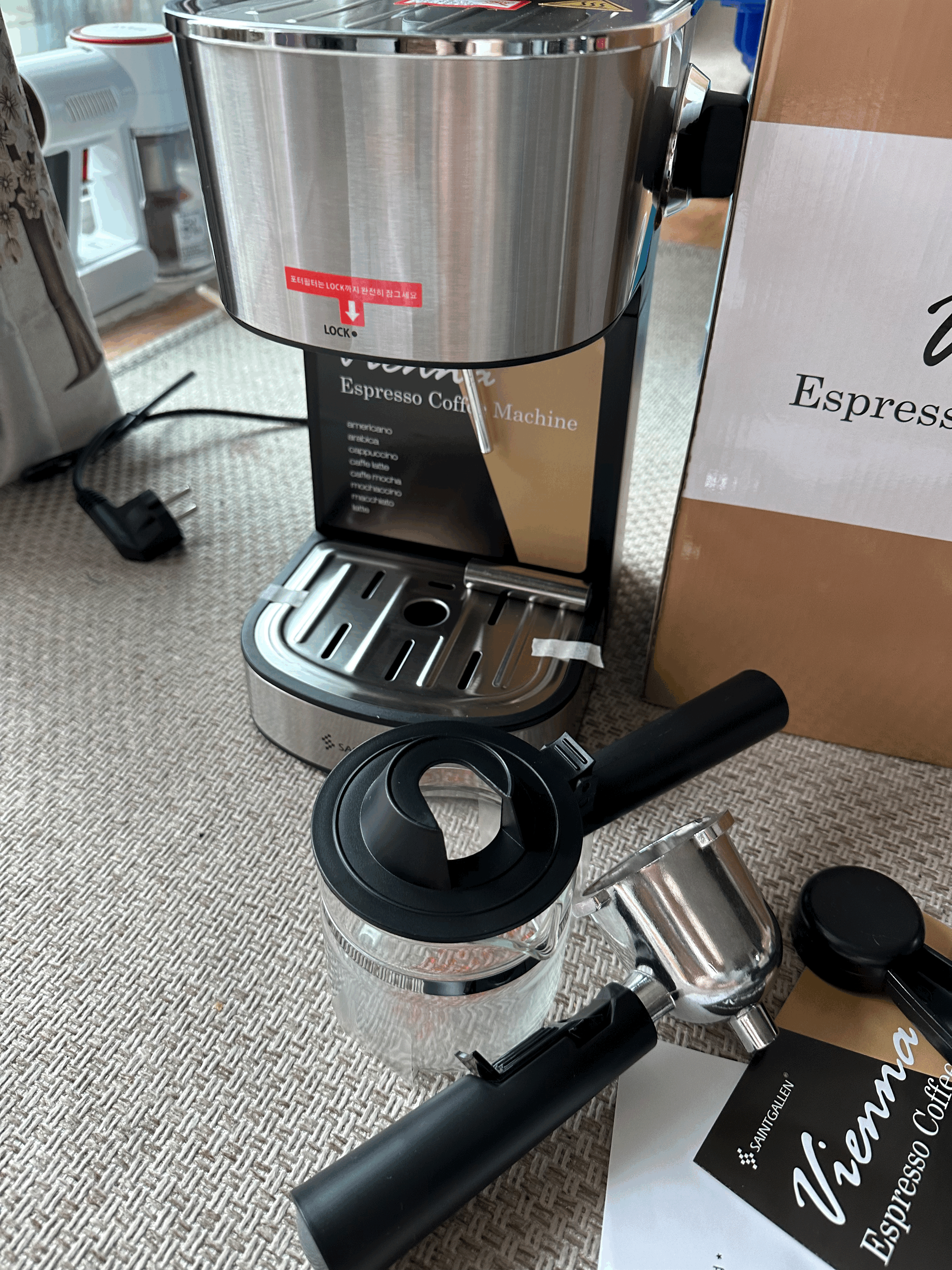 돌체구스토 계속 사용하다가 캡슐 커피 가격이 점점 비싸진다는 생각이 들어서 그냥 가루 내려서 부루드Brewed로 마실을까 하다가, 중고 거래 어플에서 세인트갈렌 비엔나 라는 커피머신 미개봉 제품을 찾아 거래했다. 2만5천원. 거래하기 전에 구매자들 후기인 것으로 그나마다 보이는 몇개의 후기들을 찾아봤는데 나쁘지 않아 보였다. 저가 중국산이겠지 하면서.. 그냥 감안하고 봤는데 새 상품은 네이버에서 6만원대이다. 그런데 이게 세인트갈렌 디카페 라는 조금 더 저렴한 버전이 있고 그거보다는 하나 위의 버전이 바로 이 비엔나라는 버전이다. 2018년부터 팔았던 것 같다. 어쨌든 거래는 미개봉박스 그대로였다.