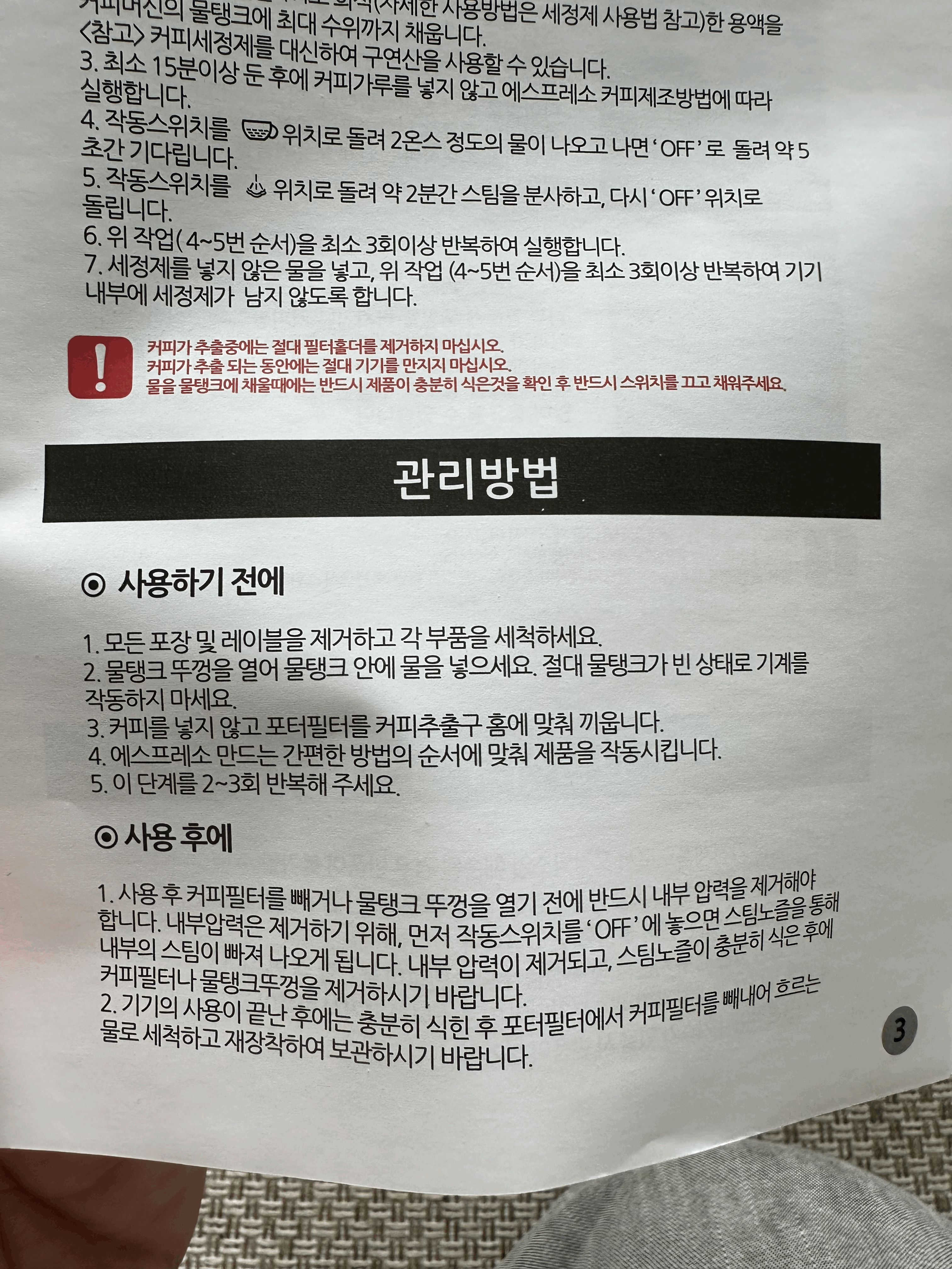 4번 정도 물을 끓여서 에스프레소 내리듯 내려서 세척을 하고 커피를 내려서 마셔 보았는데 맛있었다. 물론 기계하고 상관없이 커피 원두의 맛이지만 . 문제는 사용법인데 음 저 커피원두 스탬핑해서 끼우는 걸 비틀어서 끼워야 하는데 처음에는 좀 뻑뻑하다고 생각해서 힘이 약한 여성들은 좀 힘들수도 있을 것 같았다. 이거 안맞는거 아냐? 하고 대충 끼웠다가 퍽 하고 압력에 못견뎌하고 터진다. 꼭 중앙까지 맞춰야 한다. 그리고 스팀나오는 부분이 금방 뜨거워지니까, 정말 조심해야 한다.
