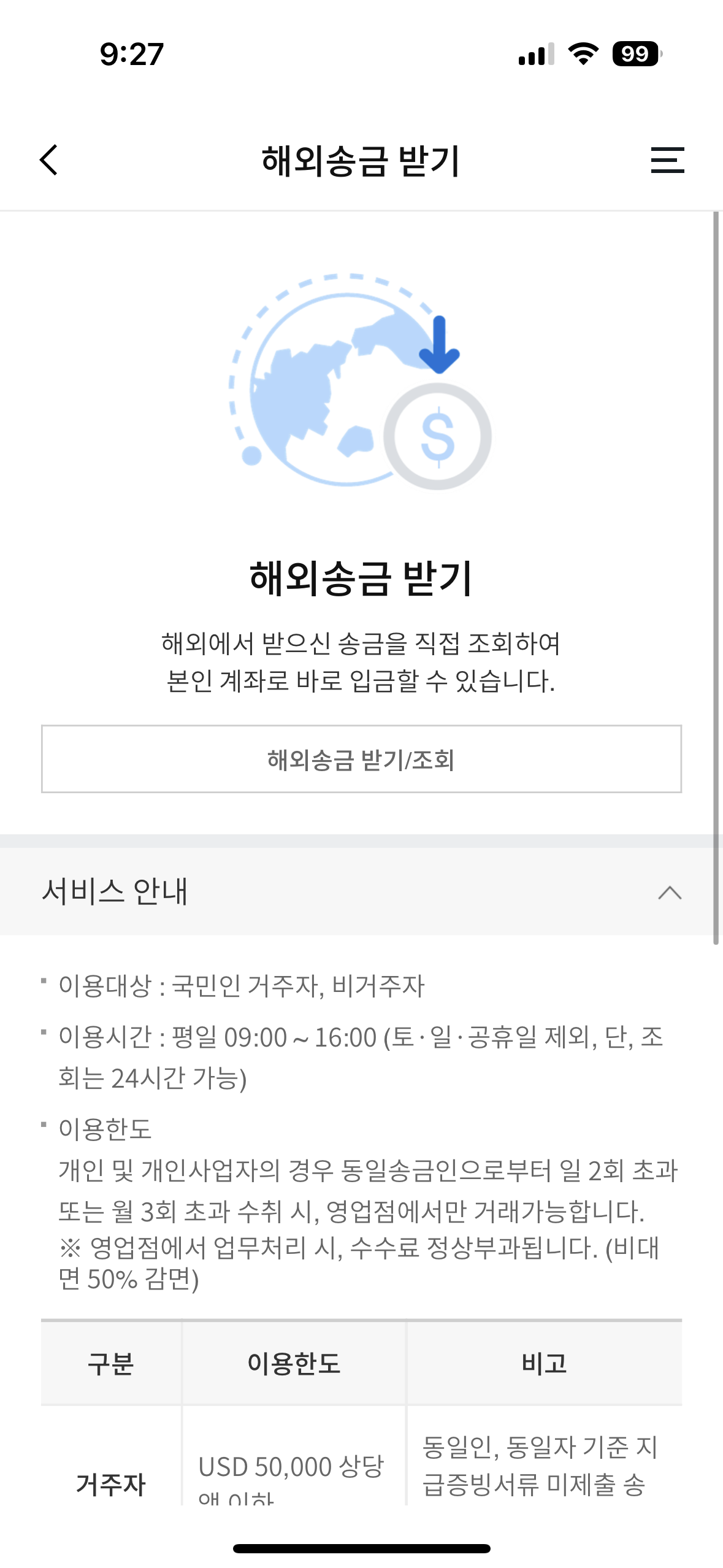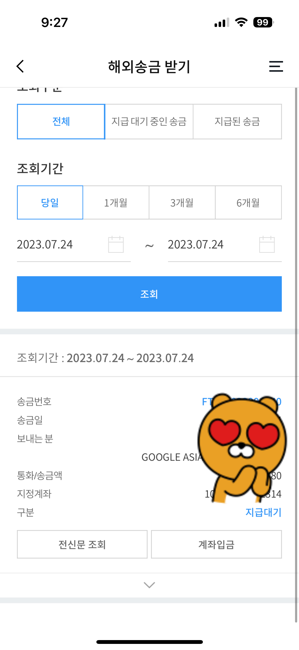 해외송금받기에서 받을 수 있는 돈이 들어왔는지 확인한다. 이 내용은 물론 구글에서 지급을 했다는 메일을 받았을때 부터 진행하는 내용이다. 이렇게 하면 최근 외환입금대기인 돈이 나온다.
