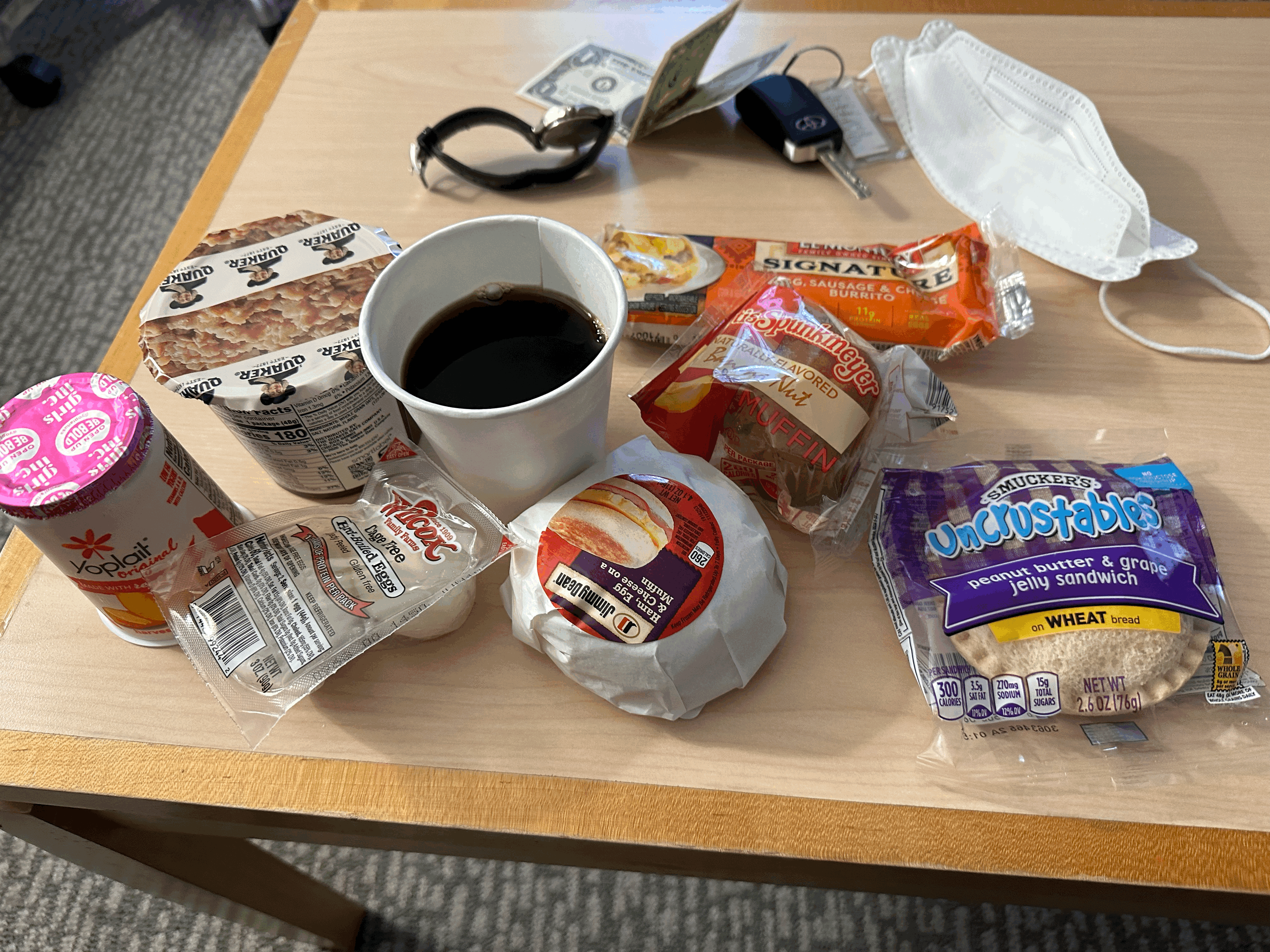 맥머핀 같은 빵이 가운데 그리고 왼쪽은 삶을 달걀, 그리고 시리얼 귀리, 요플레, 또띠야같은 빵, 머핀, 그리고 블루베리젬들어있는 빵.