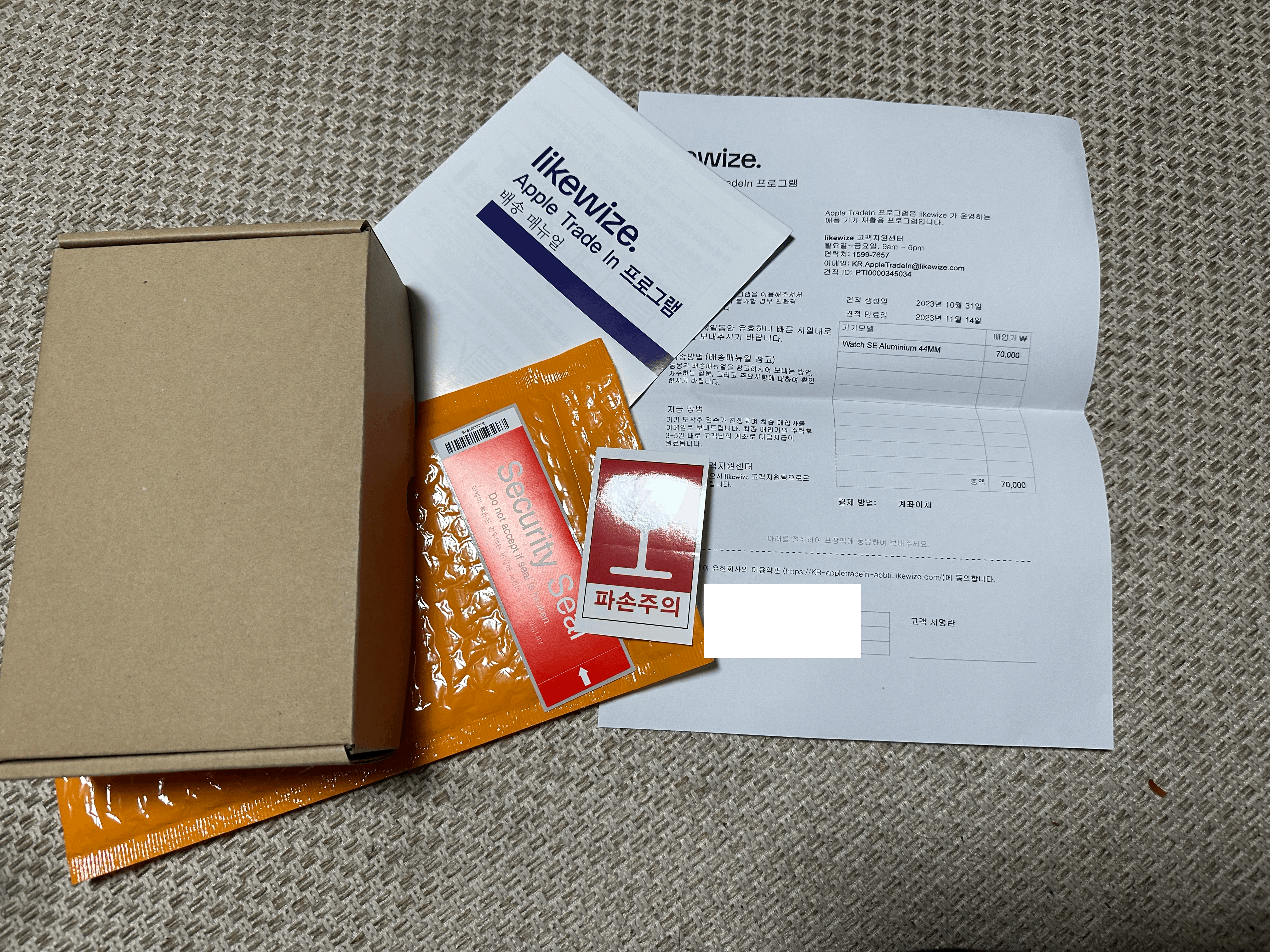 안전뽁뽁이봉투에 애플워치 시계 본체만 집어넣고 충전기나 밴드는 보내지 않는걸로 되어 있다. 충전기를 보내지 말라는 내용은 따로 없으나 어댑터 같은건 보내지 않아도 된다고 되어 있다.
