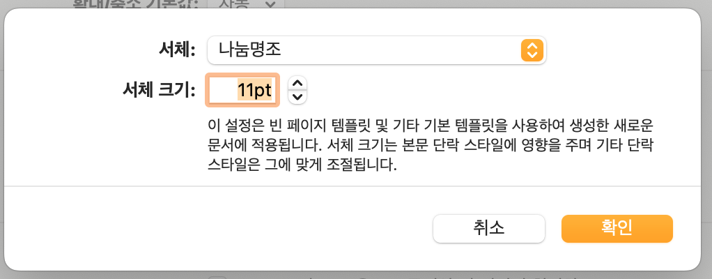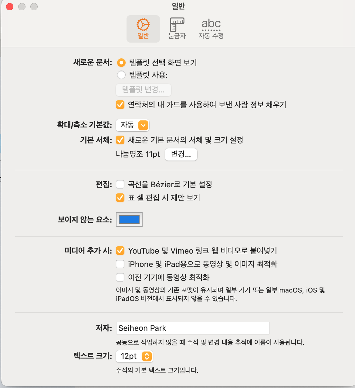 기본적으로 글꼴이다. 맥에서는 글꼴이라고 안하고 서체라고 하거나 폰트라고 하는데 페이지를 실행하면 바로 사용되는 서체를 변경하려면 어떻게 할까? 페이지를 실행하고 환경설정 메뉴를 켠 후 첫번째 일반 탭에서 '기본 서체'라는 부분을 체크박스를 해야 한다. 그리고 여기서 한글에 적합한 나눔명조체나 기타 자기가 원하는 글꼴로 변경하면 된다.