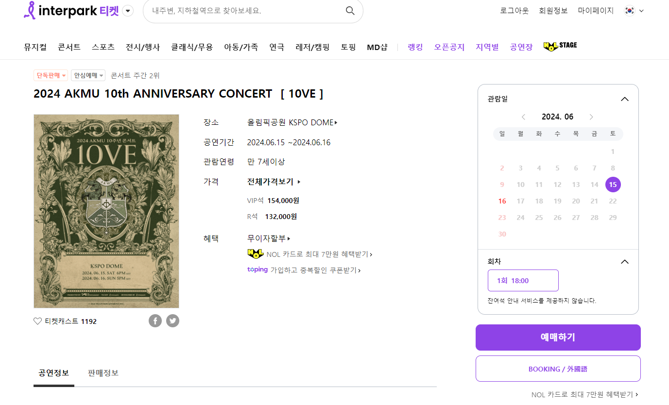 를 올림픽체조경기장 올림픽공원 KSPO DOME( 에서 6월 15에 하는데 벌써 부터 예매가 열렸다. 지난 주에 부랴부랴 접속을 해서 티켓을 사는데 성공했다. (사실 2장을 샀는데 하나는 포기 - 환불했다).