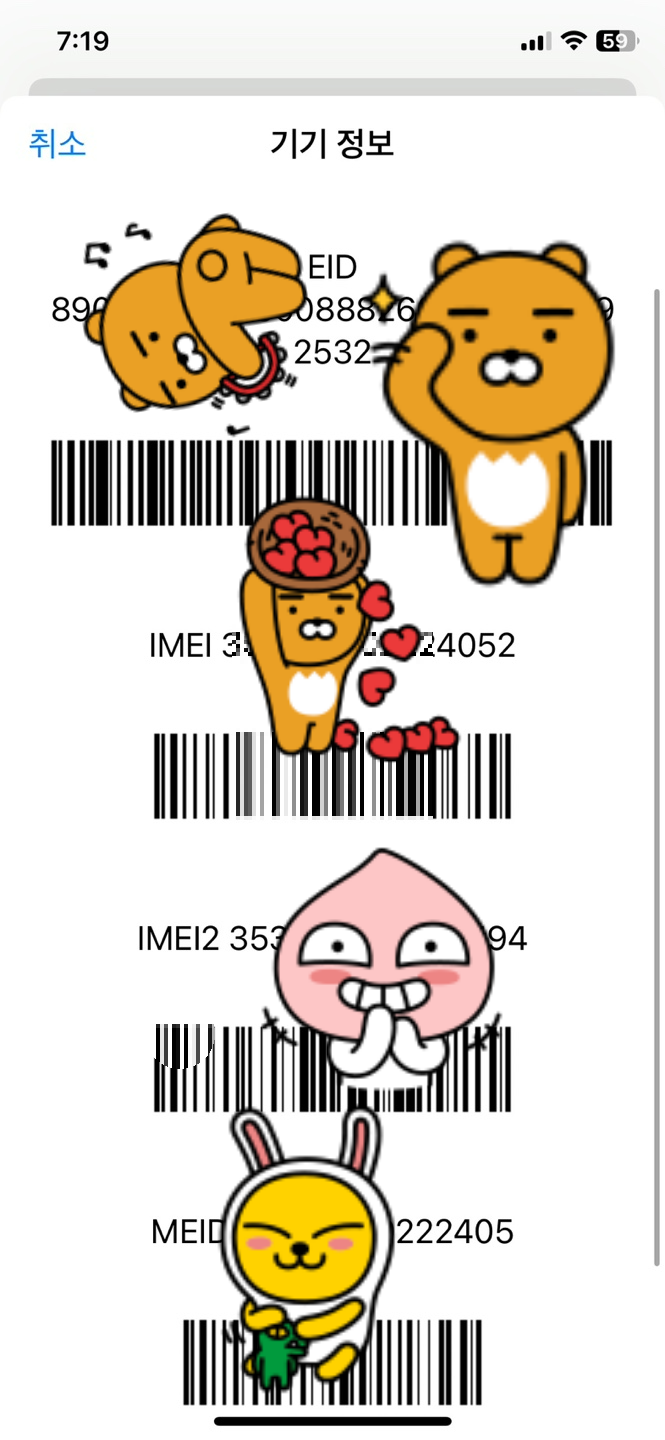 그런데 그 다음 문제 아이폰11프로를 사용하고 있는데 이게 eSIM이 되는지 유심을 써야하는지 확인이 필요했다. 사용하는 폰이 eSIM이 되는지 확인하는 방법은 *# 06 #을 눌러보면 화면에 eSIM 정보가 2개가 뜨면 된다.