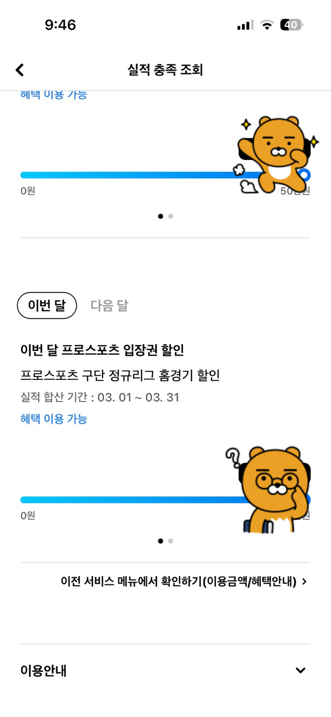 1. 프로스포츠할인 이라고 나오는데 ..... 이거 매우 제한적인 일부 구단의 일부 종목만 할인된다. 보다시피 실적 조회 화면을 가면 무슨 프로스포츠 다 할인하는것처럼 보이지만 더 찾아보면 프로야구는 기아 타이거즈 홈경기 (그러니까 광주에서 보라는건가...)만 할인된다. 이게 어떻게 프로스포츠 할인이라는 제목인지.. 문제는 그 다음에 더 심각하다.