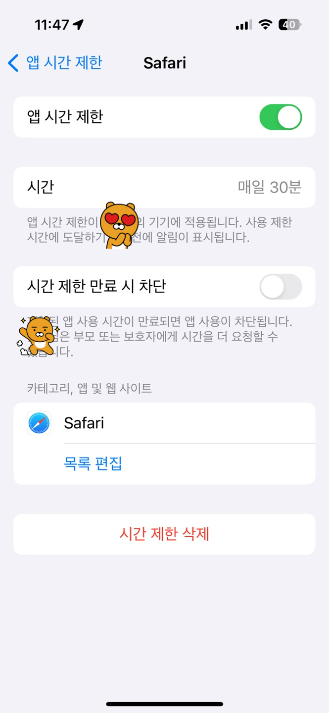 분명히 시간제한을 거는 이유가 있고 그래서 스크린타임을 쓰는건데 이렇게 오늘 하루 제한 무시가 떠버리면 이걸 설정할 이유가 없지요.