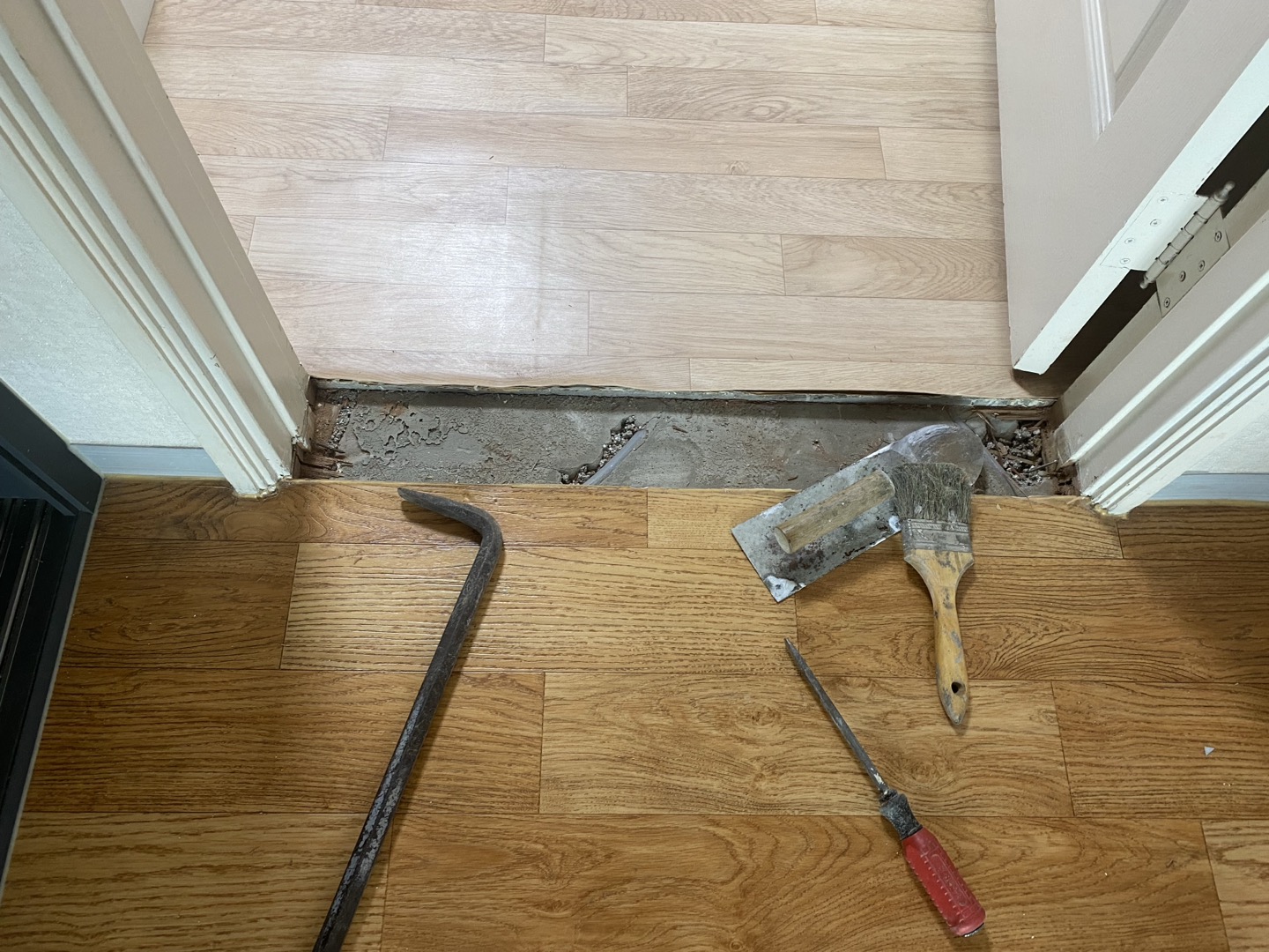예전에 살던 신축 아파트에는 방문 문턱이 없었는데 오래된 아파트로 이사를 오니 문턱, 문지방이 있네요. 어른들은 오래전부터 익숙해서 문지방을 잘 넘어 걸어다니는데 아이가 있는 집이나 청소등을 할때 불편하여 문지방을 떼어내기로 하였습니다. 집근처 집수리 하는 곳에서 저렴하게 했어요 동네마다 다르고 집수리하는곳마다 다른데 아파트 단지가 크고 집수리하는 곳이 거의 우리아파트만 전담으로 하는 곳이라 아주 저렴하게 해주었습니다. 방 2군데를 합쳐서 10만원에... 보통은 한개당 20만원 받는 것 같더라구요.