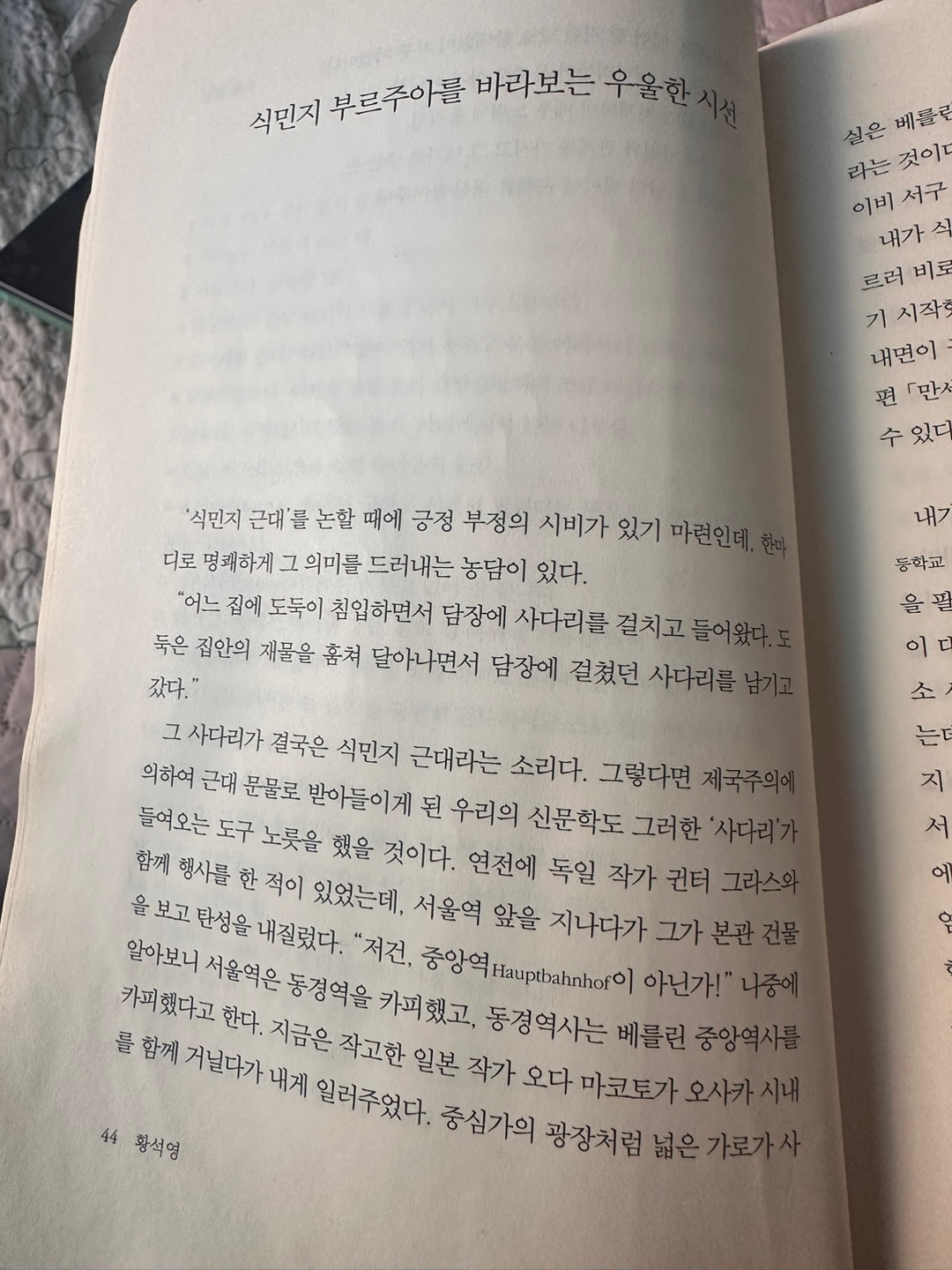 줄거리는 이렇고, 이 소설을 황석영신수정은 식민지근대화론을 꺼내면서 비평한다. 그러니까 당시 식민지 시대 문물로 한국이 발전했다는 어이없는 논리를 우선 이야기한다. 일제라는 도둑은 수탈을 위해 사다리를 가져다 놓았을 뿐이고 그걸 놓고 해방 이후 도망간건데 친일 세력들이 일제 덕에 근대화가 되었다고 말하는 것이 어처구니 없다는 이야기다. 그리고 이 근대화 조차도 일본은 서구의 것을 가져다 놓은것이어서 사이비이고 일제라는 필터를 거쳐 만들어진 근대화라는 것이다.