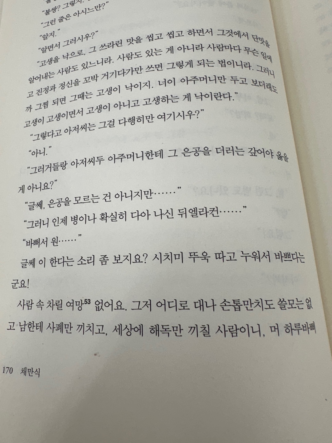 그리고 마지막 부분에 드디어 서른셋 먹은 사회주의자 아저씨와 대화를 하는 장면이 이 소설의 백미이다. 주인아저씨에게 당신 왜 이렇게 못났냐? 그깟 사회주의 뭐가 좋은거냐, 아저씨는 아씨에게 미안하지도 않냐 이런 이야기를 직설적으로 풀어놓고 아저씨는 말이 안통하는 이 조카에게 이렇게도 설명하고 저렇게도 설명하다가 결국은 설명도 포기하고 만다.