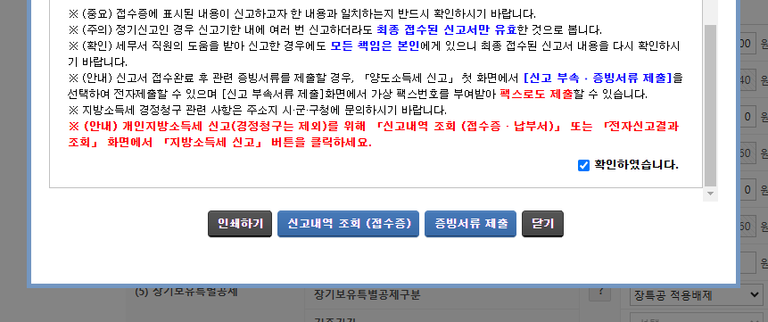 그리고 다음 단계로 가면 신고가 끝납니다. 하지만 여기서 또하나 중요한 사실 양도세는 국세이고 여기에 10퍼센트를 지방세를 내야 하는것 다들 아시죠? 그래서 지방세 신고도 번거롭지만 세금을 내지도 않는데도 신고해줘야 합니다.